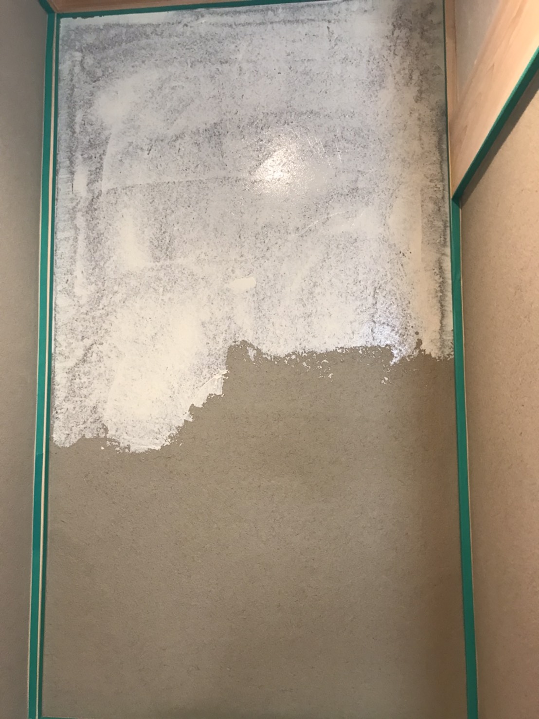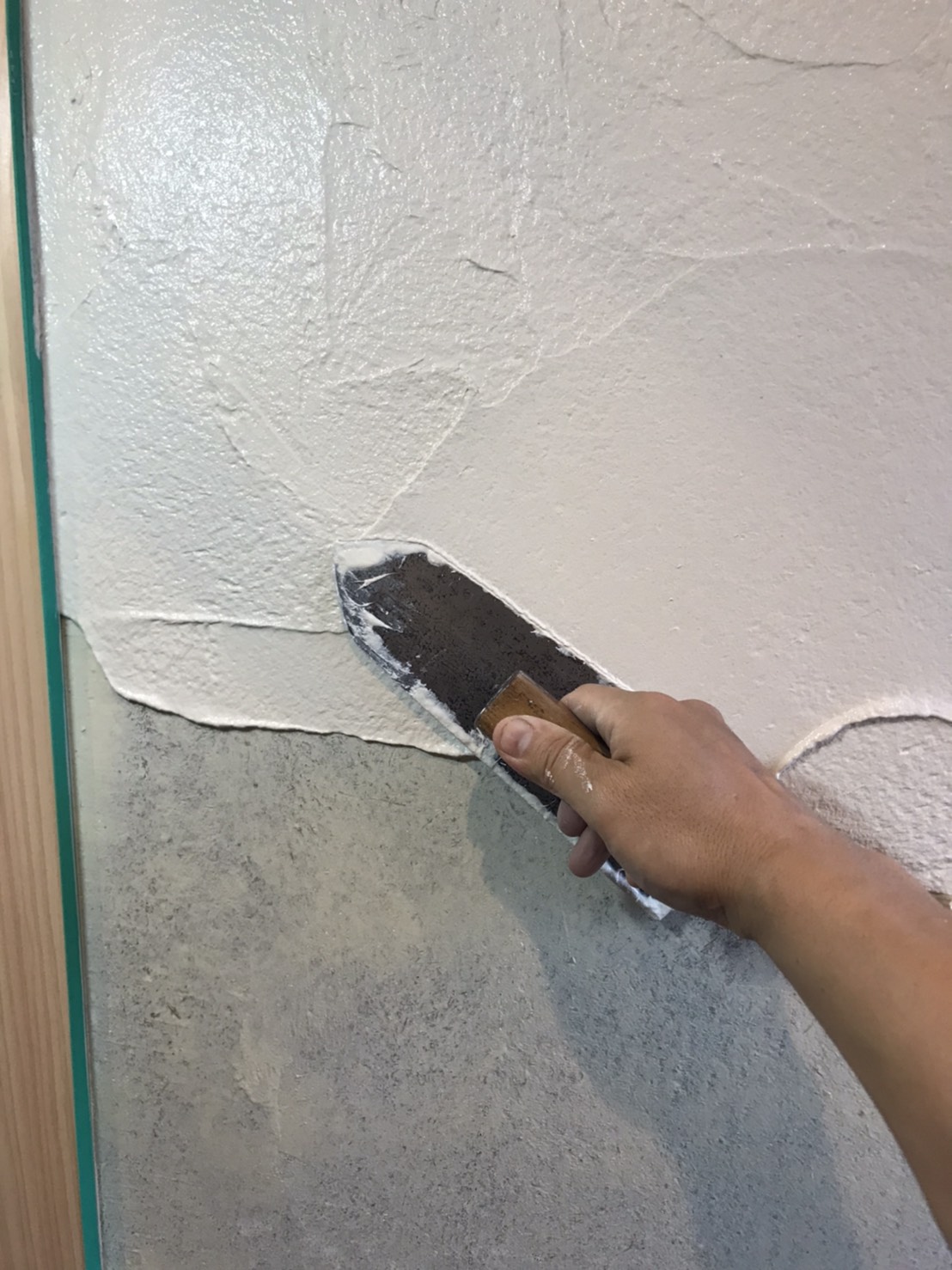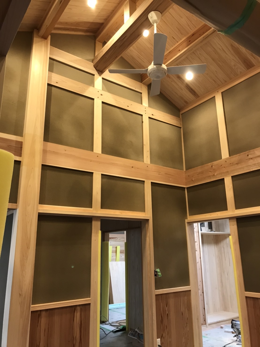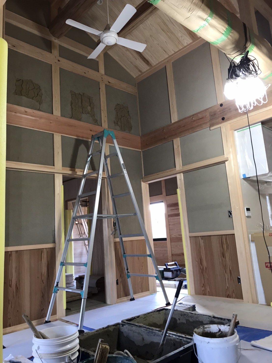 自社製天然漆喰のパターン仕上げと地元で採れる粘土質の強い土に、砂・ワラを混ぜて練り合わせた材料で仕上げました。