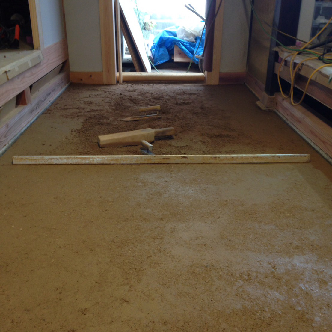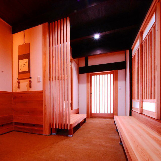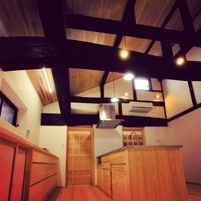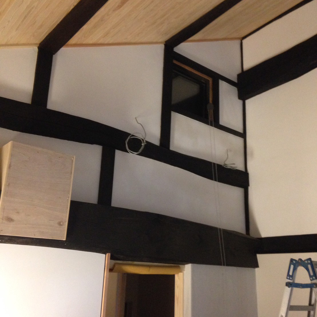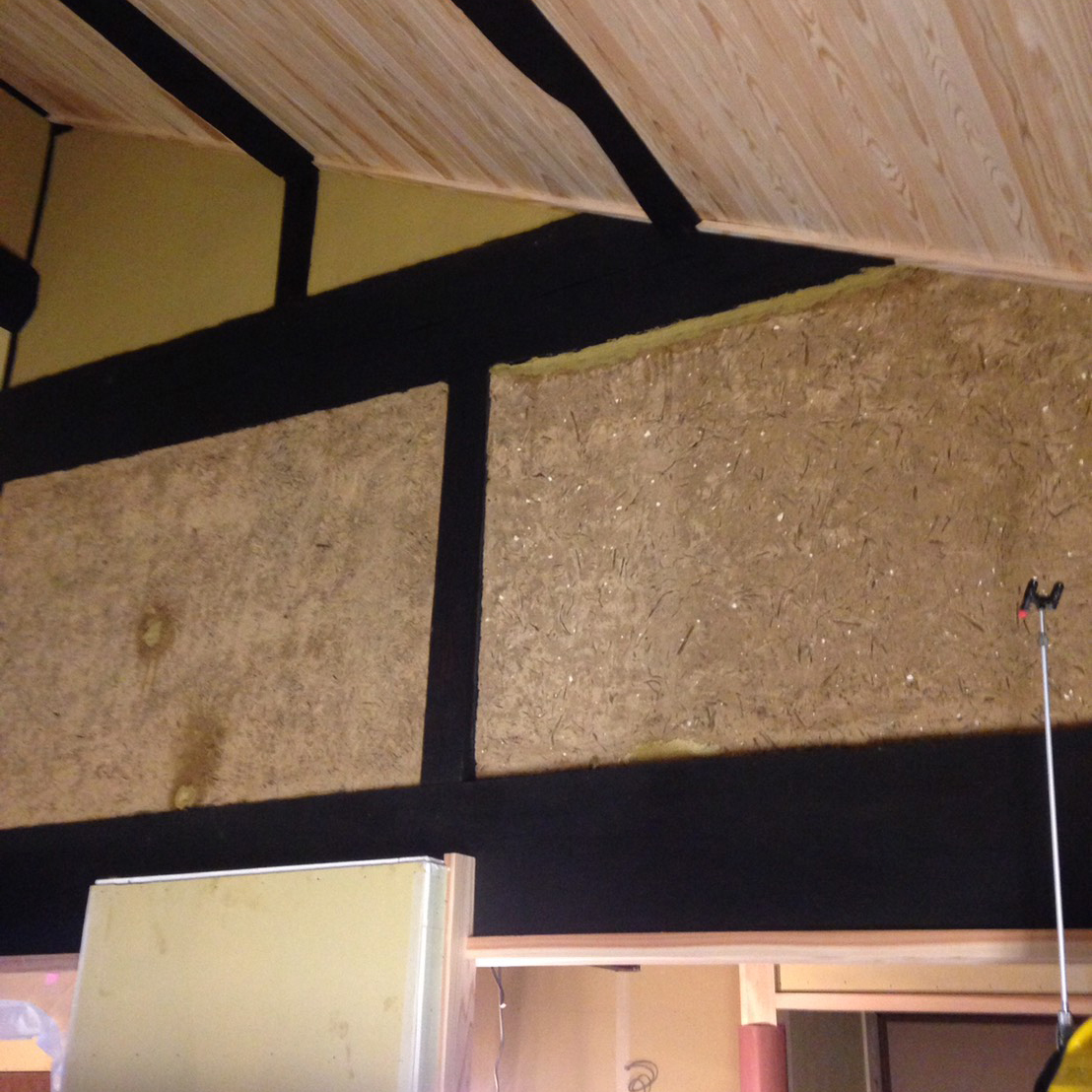 古く傷んだ土壁や脆弱ヶ所を剥がし、新たに復旧。仕上げは漆喰の抑え仕上げ。土間はマサ土に消石灰、にがりを混ぜ合わせ叩いて締め込む三和土(たたき)仕上げ。