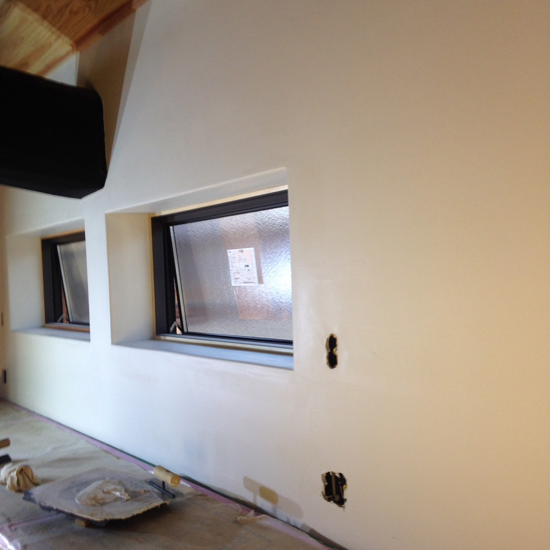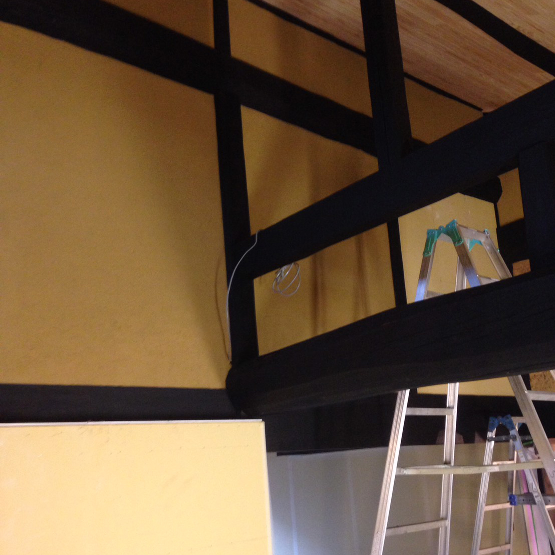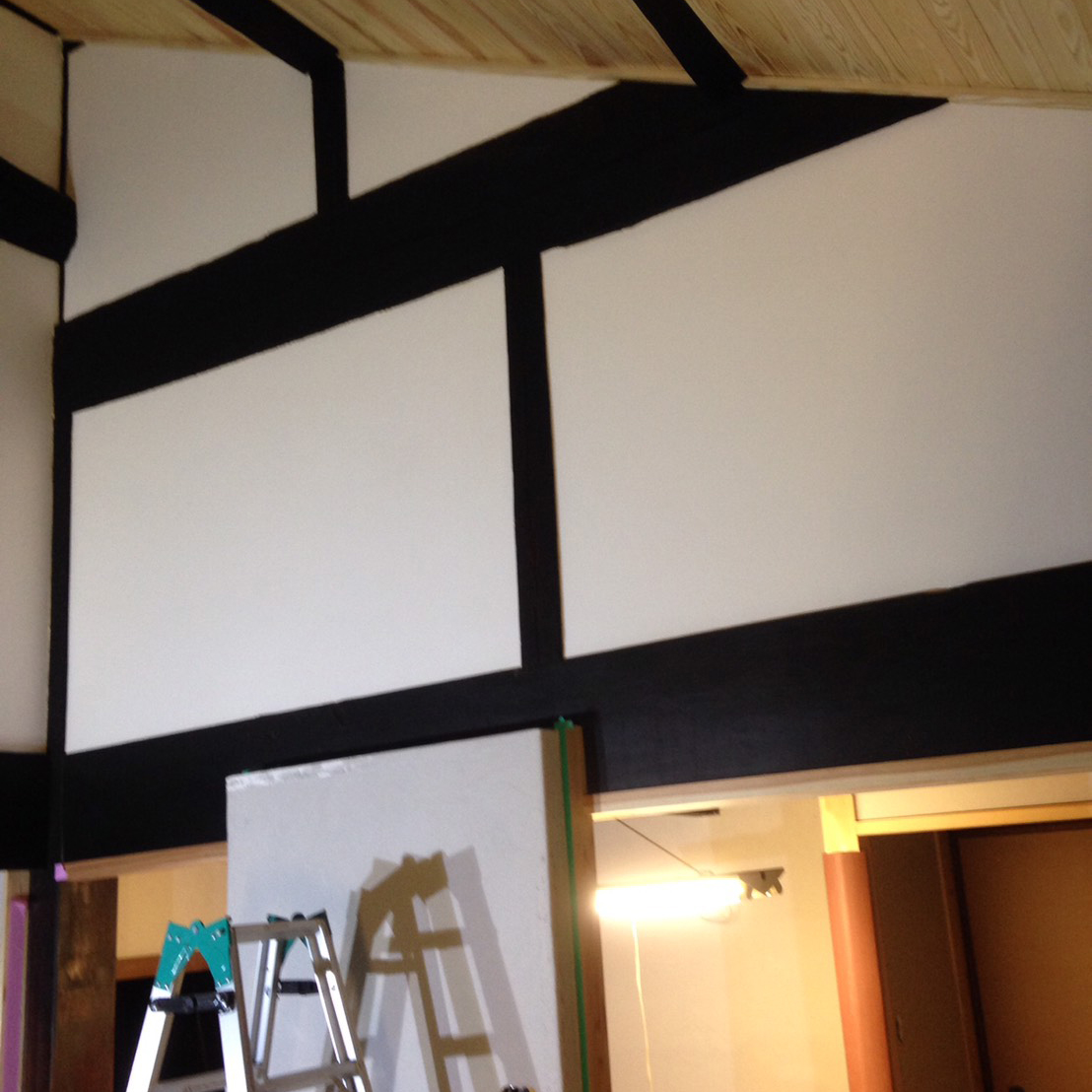 古く傷んだ土壁や脆弱ヶ所を剥がし、新たに復旧。仕上げは漆喰の抑え仕上げ。土間はマサ土に消石灰、にがりを混ぜ合わせ叩いて締め込む三和土(たたき)仕上げ。