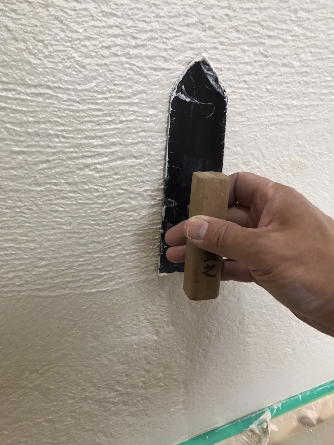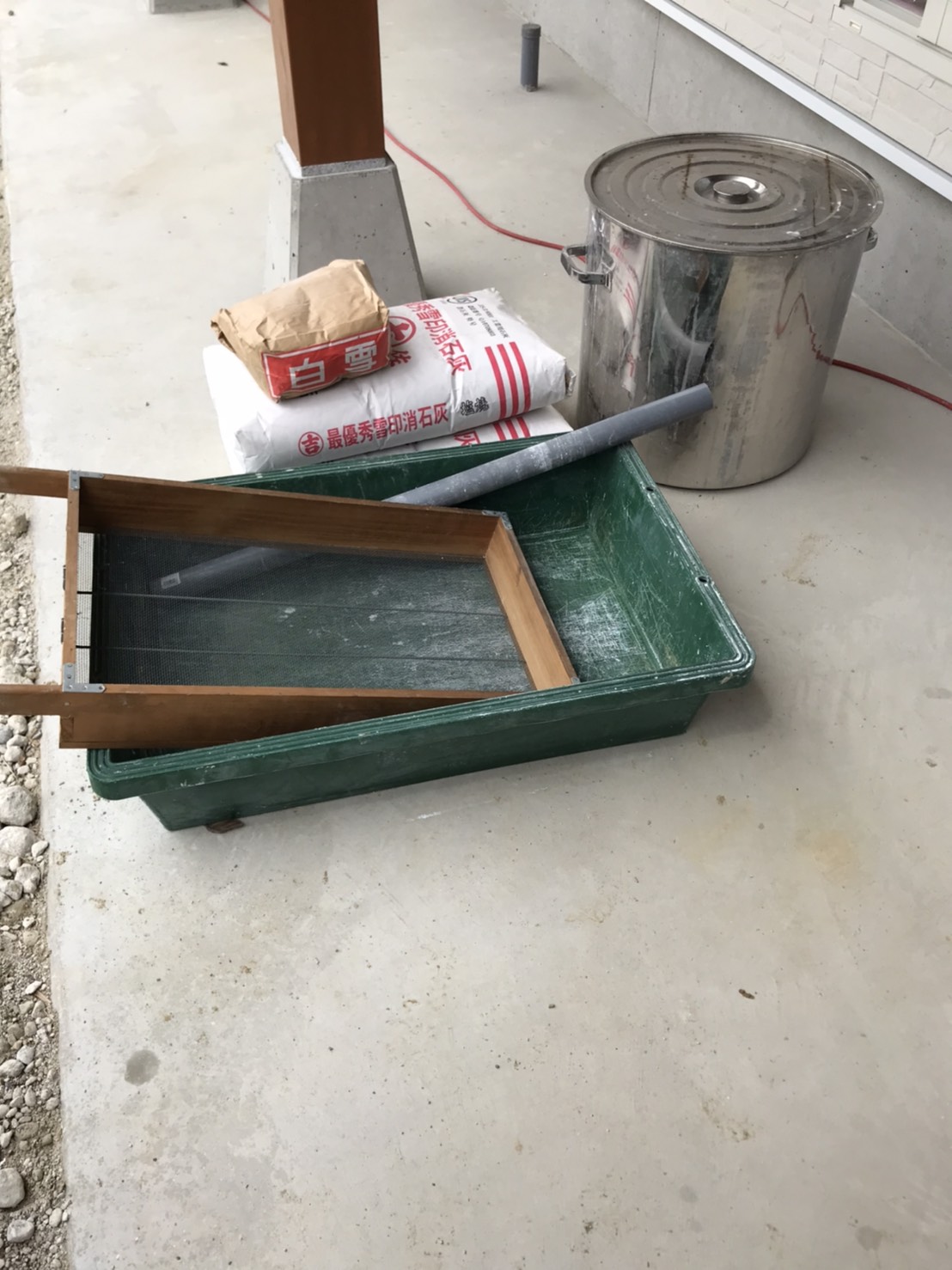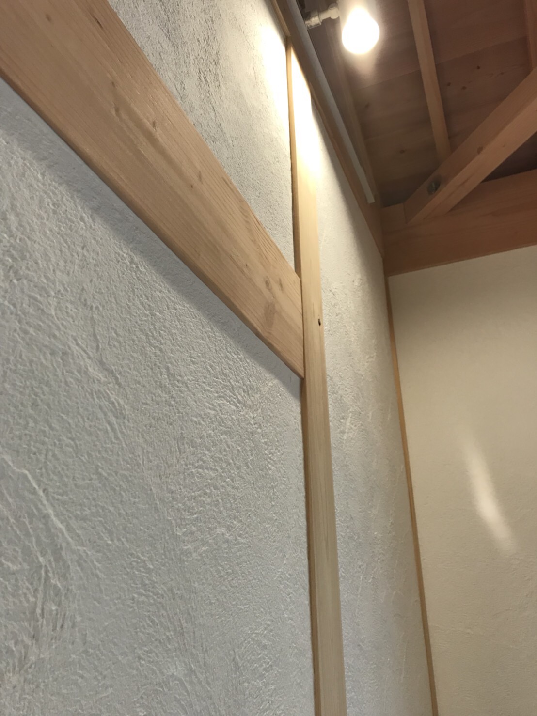 消石灰・麻スサ・海藻のリを調合し、混ぜ合わせて作った天然の漆喰のパターン仕上げ。